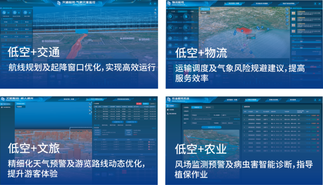 基于天信·低空气象服务平台和eTAPES2.0多领域综合气象技术底座,融合AI驱动的气象预测大模型和智能服务引擎,实现低空气象精细化预报、智能化分析,支撑飞行计划、起降场、航路航线等管理系统,精准防范风切变、湍流等灾害,为低空应急救援、空中交通、物流配送、文旅观光、农林植保等场景提供全天候低空气象安全保障。