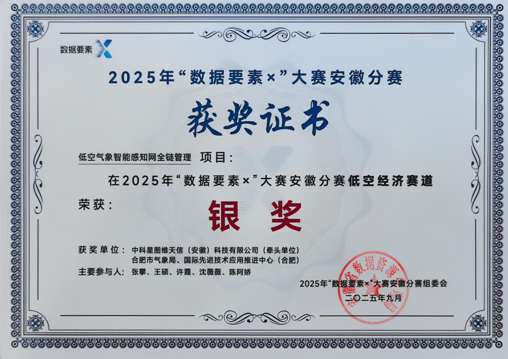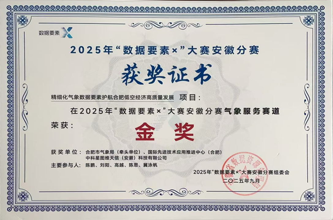 日前,在2025世界制造业大会-数据要素综合试验区创新成果暨新模式新场景对接会上,由合肥市气象局、中科星图维天信(安徽)科技有限公司(以下简称“星图维天信低空气象公司”)、国际先进技术应用推进中心(合肥)共同参与的两大低空气象项目分别荣获“数据要素×”大赛安徽分赛金奖、银奖。