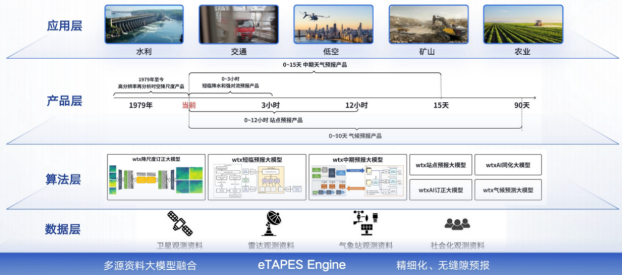 基于气象预测大模型的无缝隙智能预报技术,综合运用Transformer、Diffusion等人工智能大模型技术,融合气象知识和物理机理,构建天信短临、中期、气候、降尺度订正等气象大模型技术体系,实现时间上从过去几十年到未来90天,空间上点、线、面全覆盖的气象无缝隙预报。