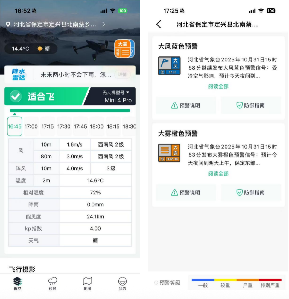 低空飞行活动高度依赖气象条件,对天气变化极为敏感。风速、湿度、能见度、气压、短临降水以及其他突发性天气现象,都可能直接威胁飞行安全。天信·低空通App深度融合低空气象监测与预报技术,构建了全要素、多维度的气象实况与预报系统,为无人机用户提供精细化的短时及中期飞行“窗口期”规划与适飞建议,帮助用户科学规划任务航线与作业时间,有效增强低空飞行的可预见性和整体安全性。