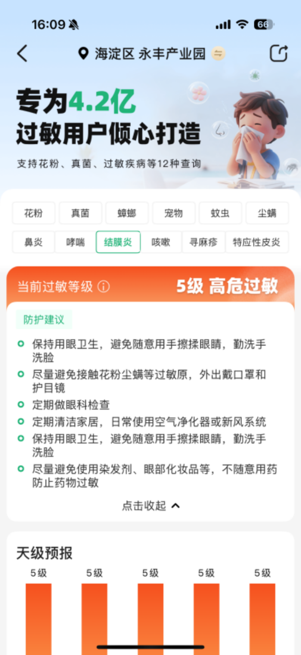 “看天API”春季推出“花粉过敏预报”,实现从传统气象服务向健康气象延伸。