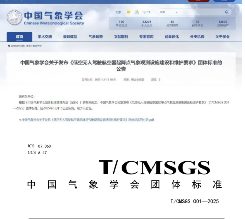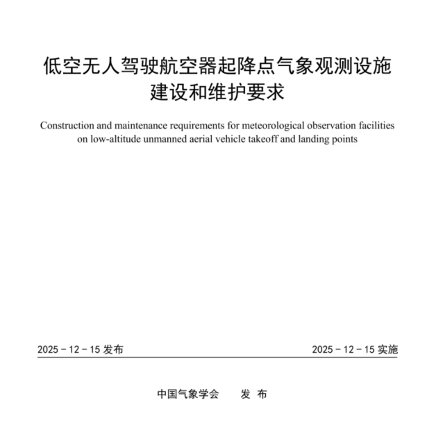 近日,中国气象学会首个团体标准《低空无人驾驶航空器起降点气象观测设施建设和维护要求》(T/CMSGS 001—2025)正式发布实施。这一标准的制定,标志着我国低空经济基础设施建设向规范化、精细化迈出了关键一步。