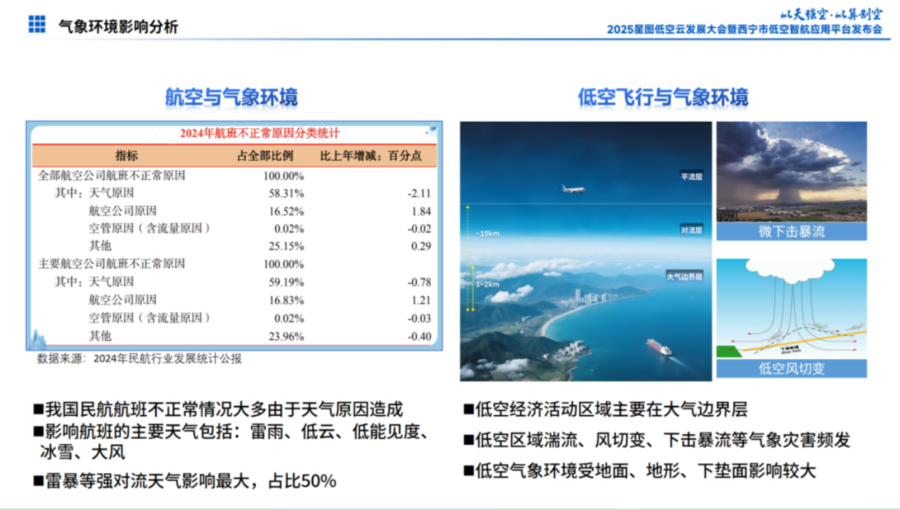 张攀指出,随着低空经济迈入万亿级规模,无人机物流、载人eVTOL、应急消防等新兴业态的爆发式增长,气象服务已成为低空安全飞行的核心基础设施。据2024年民航行业发展统计公报数据显示,约58.31%的航班不正常原因是天气导致,而低空飞行主要在大气边界层(距地面0-2公里),受地形、建筑群和地面热力作用影响,湍流、风切变、下击暴流等微尺度气象现象更为频发,传统气象服务在垂直分辨率(米级)和时效性(分钟级)上均难以满足需求。