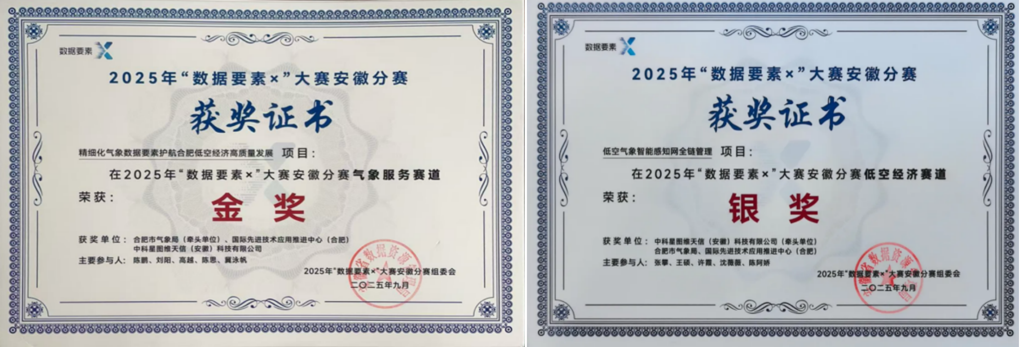 在2025世界制造业大会-数据要素综合试验区创新成果暨新模式新场景对接会上,由合肥市气象局、中科星图维天信(安徽)科技有限公司、国际先进技术应用推进中心(合肥)共同参与的两大低空气象项目分别荣获“数据要素×”大赛安徽分赛金奖、银奖。