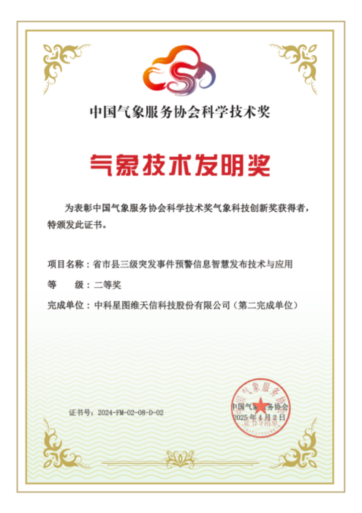 2024年度中国气象服务协会科学技术奖评选结果正式公布,星图维天信荣获气象技术发明二等奖及“风云青年科技奖”两项殊荣。